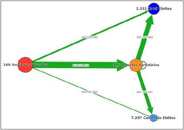 Os 165 agentes partidários com alta centralidade financiaram diretamente 8.165 candidatos, o que equivale a 57,1% das 14.299 candidaturas do componente gigante – sendo 1.202 exitosas, ou 74% dos eleitos nesse componente. Os candidatos receberam R$ 1.155.322.850,00 em 9.738 doações provenientes desses agentes. Esse valor representa 75% da receita dos agentes partidários centrais, porcentual que se origina de apenas 0,08% dos doadores privados de campanha em 2010, evidenciando a procedência concentrada de recursos em algumas poucas dezenas de doadores.