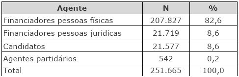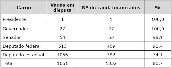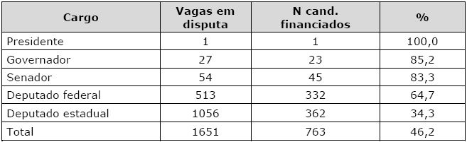 Ressalte-se que esses 165 financiadores, malgrado apoiarem uma grande quantidade de candidatos e partidos, representavam apenas 0,8% dos doadores privados na campanha de 2010. Portanto, menos de 1% dos doadores privados, em sua ampla maioria os principais grupos empresariais do país, financiaram diretamente, dentre os eleitos, 85% dos governadores, 83% dos senadores, 64% dos deputados federais e 34% dos deputados estaduais.