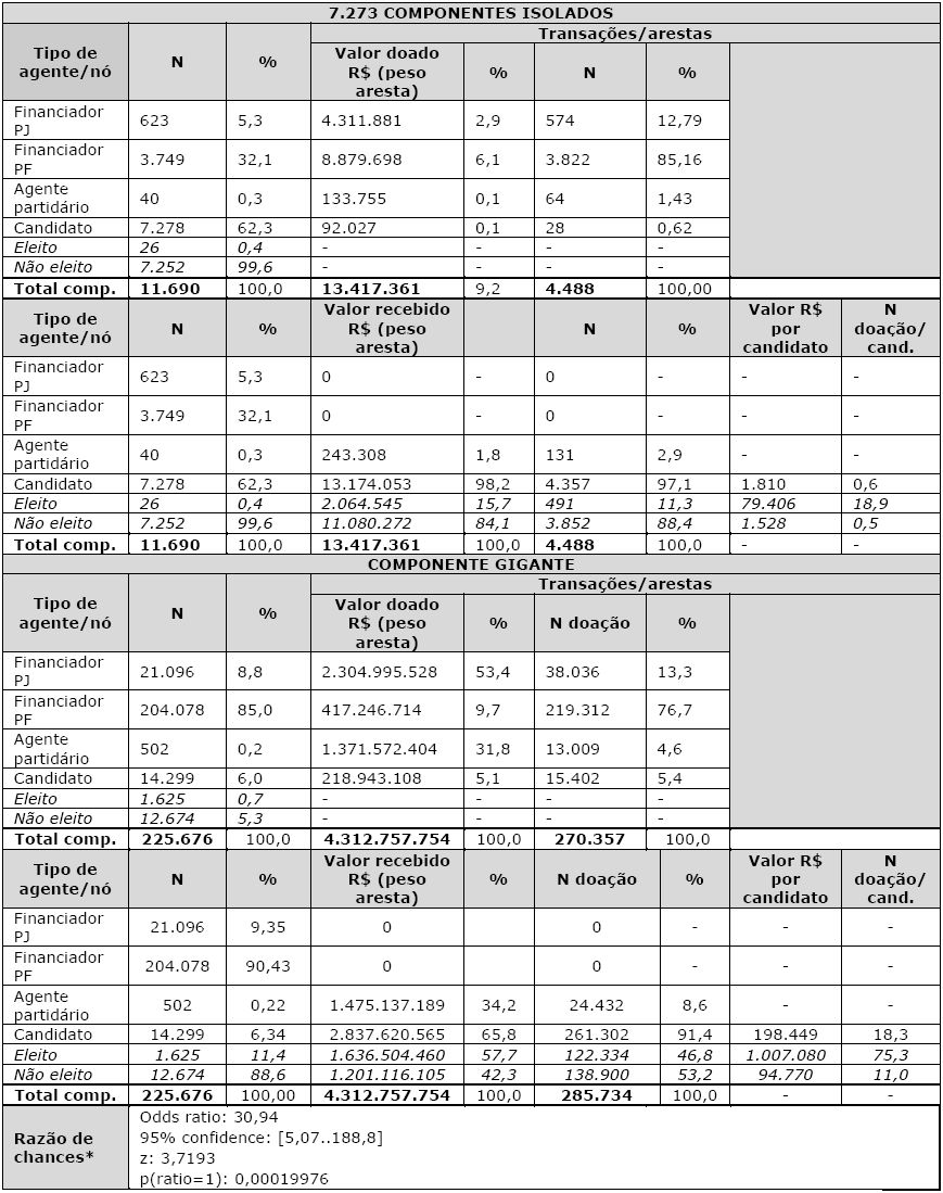 Esses achados evidenciam um traço estrutural relevante da rede de financiamento eleitoral de 2010: pertencer a um componente isolado, ou seja, estar desconectado do componente gigante acarreta drástica redução das possibilidades de êxito: um candidato no componente gigante tem quase 31 vezes mais chances de estar entre os eleitos do que um em componente isolado (cf. teste de razão de chances (odds ratio) presente na Tabela 2, comparando os eleitos nos componentes). Isso indica que buscar os atores centrais na topologia da rede implica examinar detidamente o componente gigante.
