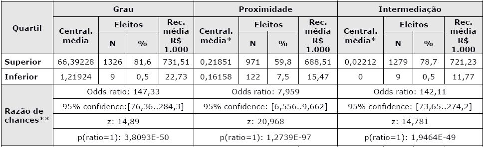 No quartil superior de centralidade de intermediação, encontramos um índice médio de 0,022 e 1.279 eleitos (78,7% do componente gigante); no inferior, nenhum nó apresentou valores para a variável em tela e há apenas nove eleitos, ou 0,5% (Tabela 3). A diferença entre as chances de um eleito compor o quartil superior em relação ao quartil inferior é de mais de 142 vezes. Portanto, centralidade de intermediação é uma variável com amplo poder explicativo na rede de financiamento eleitoral de 2010, permitindo afirmar a relevância da associação entre poder econômico, influência e sucesso eleitoral.