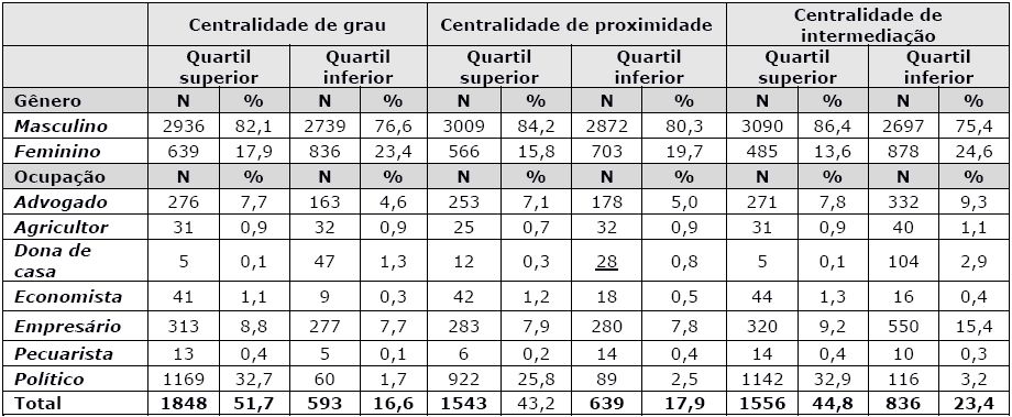 Nota-se que, em todos os casos, a proporção de mulheres é sempre maior nos quartis inferiores de centralidade. No tocante à ocupação, há uma baixíssima participação de donas de casa, embora o número seja expressivamente maior nos quartis inferiores. O dado mais interessante é que em todos os quartis superiores os políticos são os profissionais mais frequentes.