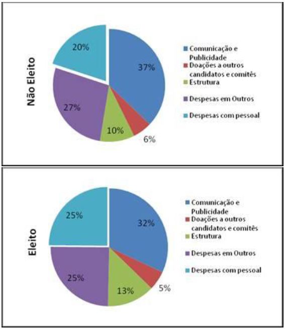 Nesse sentido o maior problema se refere à categorização de "outros gastos". Somente para deputado federal, por exemplo, vimos que 25% da despesa dos eleitos e 27% da dos não eleitos foram classificadas como "outros gastos", conforme nos mostra o Gráfico 1 (p. 63). Esse dado nos mostra que as campanhas, por mais que tenham se profissionalizado, ainda carecem de uma estrutura mais transparente. Sendo esse um fator característico predominante, especialmente entre os candidatos mais fortes eleitoralmente.