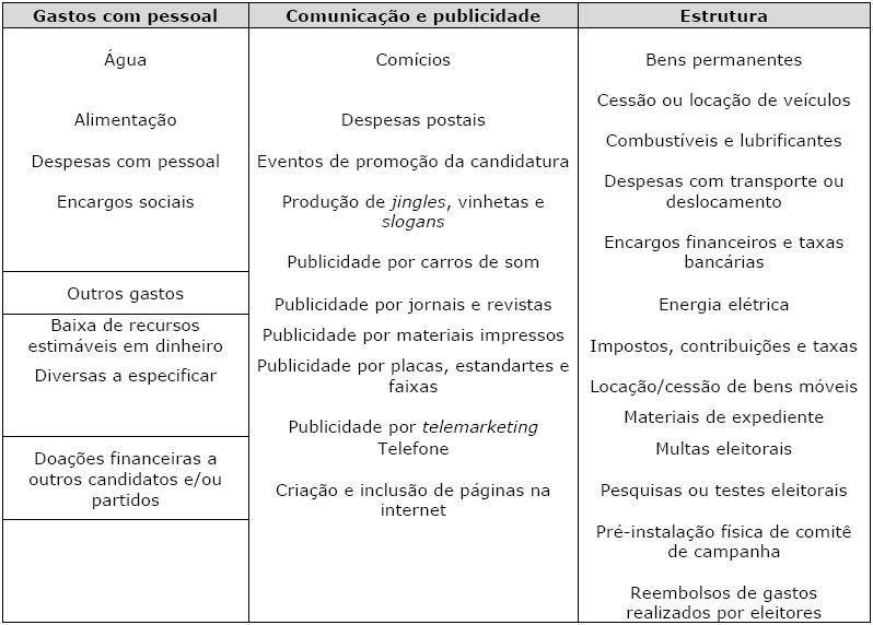 Procuramos categorizar esses gastos de acordo com o entendimento básico acerca do funcionamento das campanhas eleitorais. Embora seja um agrupamento arbitrário, tentamos coincidir, intuitivamente, as despesas da maneira mais aproximada possível. Da mesma forma, reconhecemos que determinadas despesas, por mais que estejam separadas por blocos distintos, podem ter conexão direta entre si. Gastos com "transporte ou deslocamento", por exemplo, podem ter relação imediata com "eventos de promoção da candidatura", ou até mesmo com "despesas com pessoal", mesmo estando em blocos distintos. Outro aspecto é que provavelmente os critérios de prestação de contas sejam muito variáveis entre as candidaturas. As despesas que presumimos serem comparáveis, na realidade, podem ter sido realizadas para eventos de campanhas de natureza diferente. Entretanto, a despeito de possíveis riscos de fidedignidade dos dados, consideramos que o Sistema de Prestação de Contas Eleitorais (SPCE) fornece as informações mais completas para a pesquisa sobre as doações de campanhas no país. A exemplo dos estudos sobre a receita dos candidatos que se deparam com o caixa 2, as pesquisas sobre as despesas igualmente devem considerar as possíveis omissões de informação.