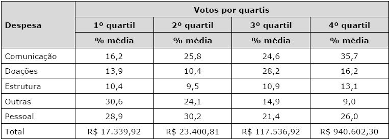 Outra forma de apreender a variação da forma como se dá o emprego dos recursos é ponderar pela votação agregada em quartis. A Tabela 2 informa que, dentre os candidatos mais votados (4º quartil), "comunicação" foi o principal tipo de despesa (35,7%), seguida das "despesas com pessoal" (26%):