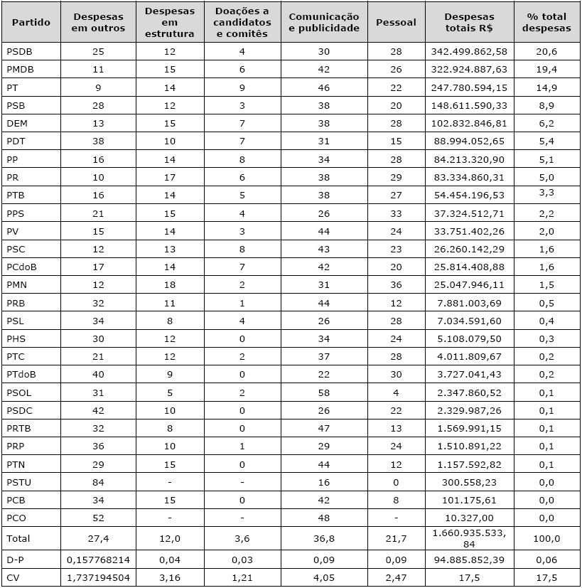 Por sua vez os partidos de direita foram os que, nessa rubrica, mais empregaram recursos: PMN 36%, PPS 33%, PTdoB 30%, PR 29%, PSDB, PP, DEM 28%. As diferenças tornam-se expressivas quando tomadas à luz do valor final de recursos que representam. Em números absolutos os candidatos do PSDB concentraram o maior volume de recursos nesse tipo de despesa com R$ 97 milhões, seguido do PMDB com R$ 84 milhões e do PT com R$ 54 milhões. Portanto, os dados reforçariam a inferência de que candidatos de partidos mais à esquerda, em tese, gastariam menos recursos com "pessoal".