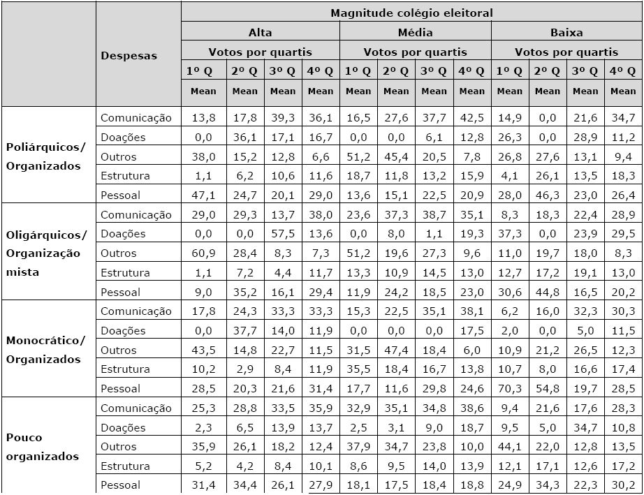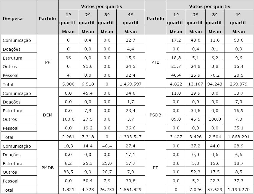 Observando a Tabela 4 com esse foco, entretanto, as médias pouco diferem entre os partidos considerando a classificação proposta por Guarnieri. Nota-se, porém, que as despesas em "comunicação" são as mais comuns dentre os candidatos situados nos maiores quartis de votos, independentemente da força do partido e da magnitude dos distritos eleitorais.