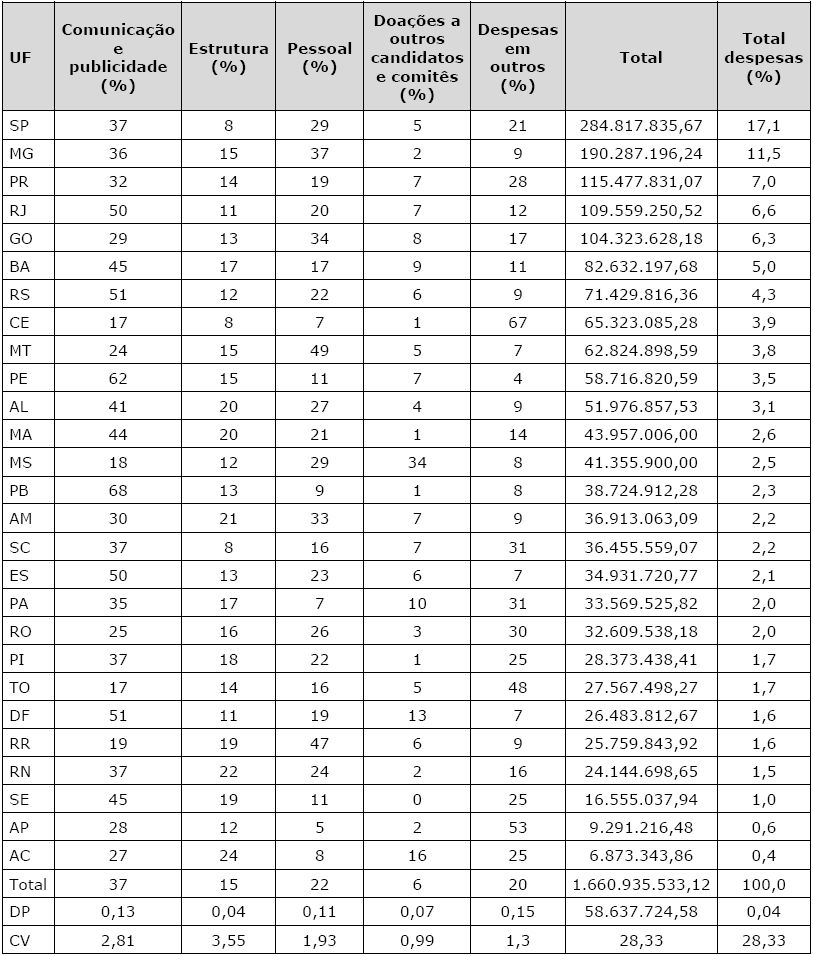 Ao observarmos o coeficiente de variação (CV) entre as despesas observadas na Tabela 2, verificamos novamente que os gastos de "comunicação e publicidade" e de "estrutura" foram os que mais variaram, com os respectivos valores de 2,81 e 3,55. Esses dados, combinados com a descrição das porcentagens nos estados, demonstram como a particularidade de cada distrito influencia muito em possíveis explicações sobre padrões de disputas e profissionalização das campanhas.