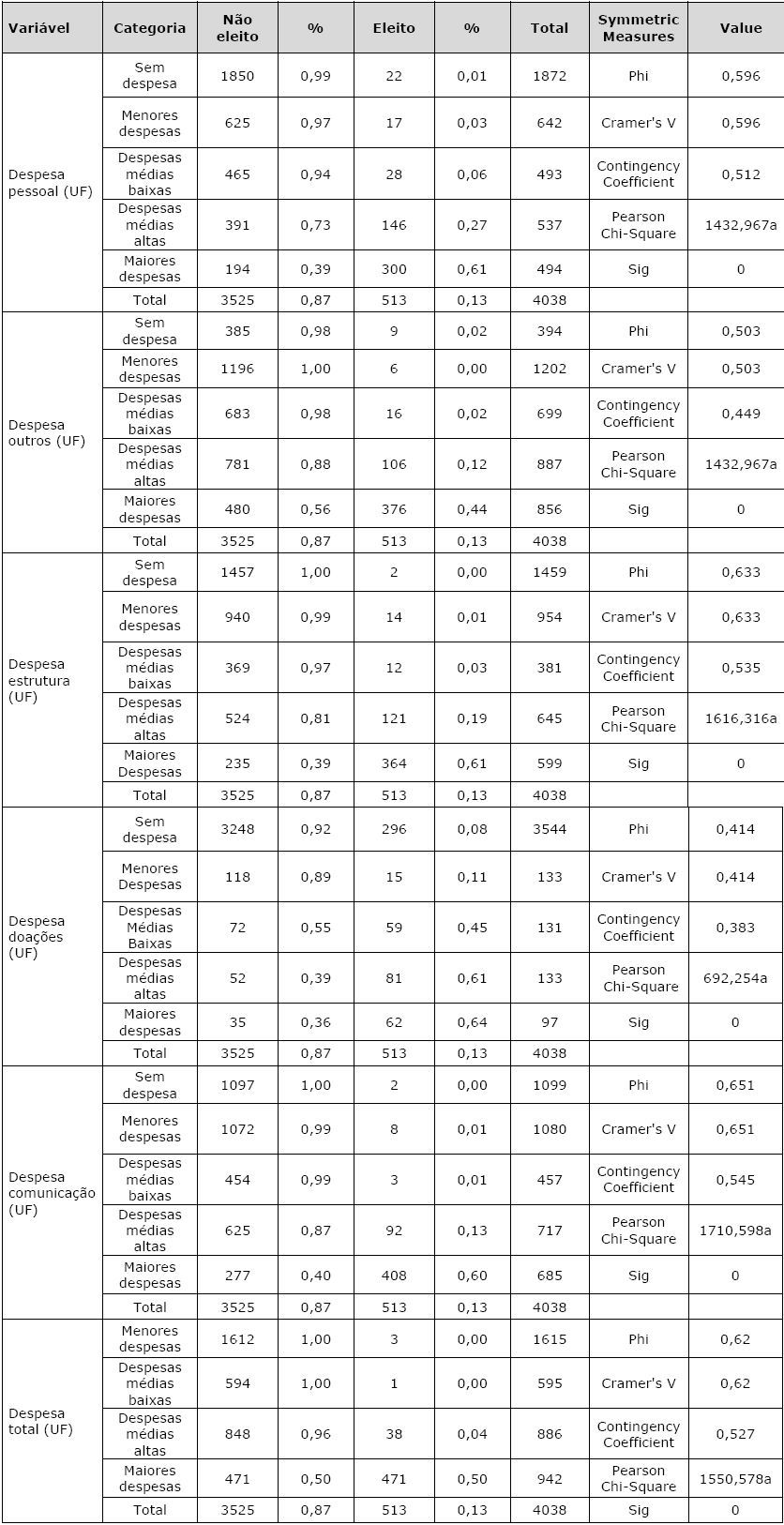 Essa variável mostrou claramente que os candidatos concentraram seus recursos em um tipo de gasto apenas. Porém, a estatística chi-quadrado não obteve significância, atestando que a distribuição dessa variável e a do sucesso eleitoral foram independentes. Para todas as outras variáveis dessa tabela os valores foram estatisticamente significantes.