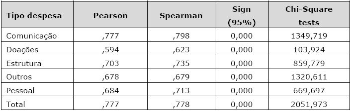 Tal discrepância pode nos levar a crer que as despesas em "comunicação" tenham maior resposta quando relacionadas a variáveis políticas, diferentemente do volume de "gastos em estrutura", os quais poderiam ser mais associados a fatores controlados por variáveis sociais e econômicas.