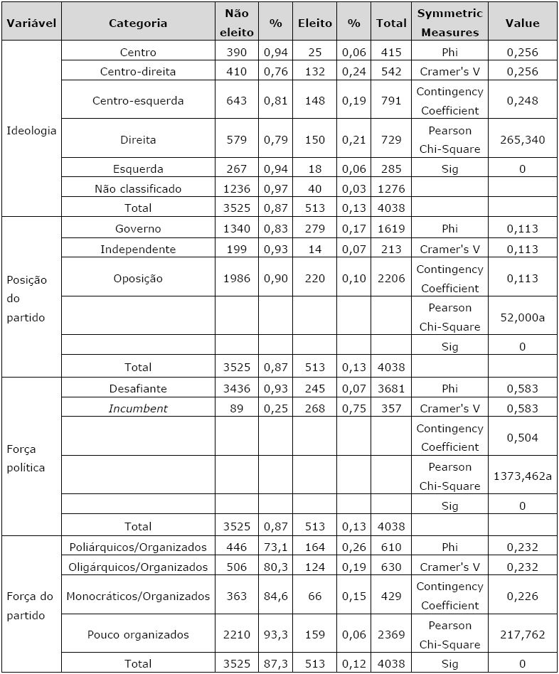 A variável "força política" mostra a já consagrada constatação da literatura do impacto dos incumbents nas eleições. Enquanto para os desafiantes a taxa de sucesso eleitoral foi apenas de 7%, a dos incumbents foi de 75%10.