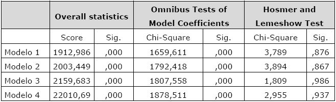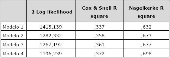 Também testamos a especificação e o ajuste dos modelos por meio de testes utilizando o chi-square. O primeiro "Omnibus" confirmou que ao menos um dos coeficientes do modelo foi diferente de zero. E o segundo, "Hosmer and Lemeshow", avaliou o seu poder preditivo do modelo. Em todos os modelos os índices foram satisfatórios.