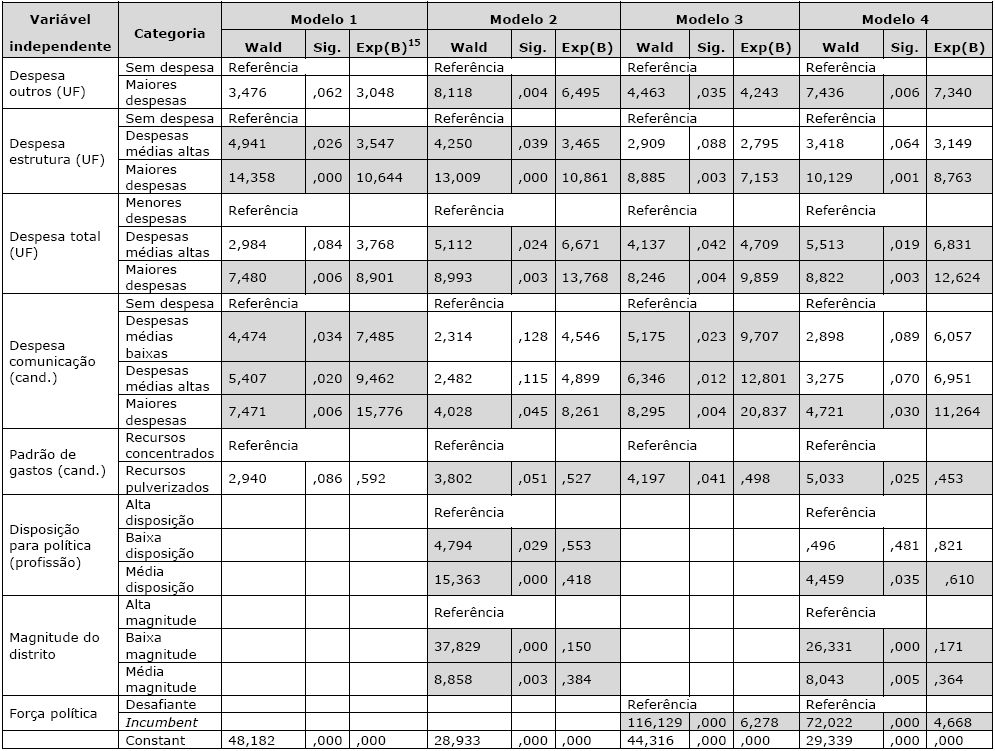 Findada a análise descritiva levada a cabo na seção anterior, na qual as variáveis independentes foram apresentadas e aproximadas por intermédio de associações diretas, existem já algumas pistas sobre a influência das diferentes formas de despesas sobre os resultados eleitorais. Contudo, essas inferências precisam ser observadas através da análise multivariada que realizamos nesta seção, utilizando modelos de regressão logística e regressão linear multivariada. Os modelos de regressão logística foram construídos da seguinte forma: 1) apenas as variáveis de despesas de campanha; 2) variáveis de despesas de campanha e variáveis socioeconômicas; 3) variáveis de despesas de campanha e variáveis políticas; e 4) variáveis de despesas de campanha; variáveis socioeconômicas e variáveis políticas.