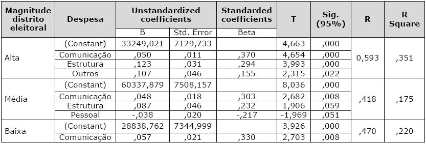 Na Tabela 18 infere-se que as despesas em "comunicação" e "estrutura" são as mais relevantes para distritos eleitorais de alta magnitude. Nesse caso, se considerássemos uma despesa hipotética de R$ 100 mil em “comunicação”, aplicando-se os coeficientes apurados na fórmula da regressão linear (y = a.x+ b16), poder-se-ia predizer uma votação de 38.249 votos, com o valor médio por voto de R$ 2,61. Ao passo que a mesma despesa na rubrica "estrutura" produziria uma votação de 45.549 com o valor médio de R$ 2,20 por voto. Pode-se deduzir assim que os gastos em "estrutura" se revertem em mais votos do que os gastos em "comunicação" para distritos de alta magnitude eleitoral. Contudo, os escores de correlação são mais fortes para despesas em "comunicação" do que em "estrutura".