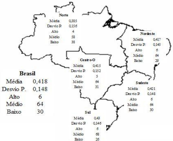 No quesito territorial, a agregação do índice por regiões geográficas (Figura 1) aponta a região Norte com o maior percentual de municípios com baixo IEP (38%) e o menor percentual de municípios com médio valor do índice (58%). Em contraste, o Sul apresentou menor percentual de municípios com baixo índice (26%) e maior percentual com médio índice (68%). Esse quadro é corroborado quando consideramos as médias obtidas por cada estado. Na região Norte, três dos seus sete estados apresentam médias abaixo da média regional (AC, AP, TO), sendo que duas delas são as piores médias nacionais, Amapá e Tocantins, ambos com IEP 0,357. O desvio-padrão das médias das regiões aponta para uma maior heterogeneidade entre os municípios da região, além da heterogeneidade observada na região Centro-Oeste. Nas demais, as diferenças na performance do IEP foram mais sutis.