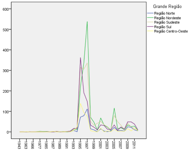 No que diz respeito às regiões, vale sublinhar algumas nuances que podem ser úteis para explicar as variações nas performances do IEP segundo esse recorte. Conforme o Gráfico 1, a região Sul tem o maior pico de criação de conselhos em 1994, logo após a promulgação da Loas (Lei Orgânica da Assistência Social, nº 8.742/1993). Seguidamente, observamos o pico do Sudeste e do Centro-Oeste. A primeira onda de expansão desses conselhos nas regiões Nordeste e Norte vem um pouco depois, em 1997. Essa variação na expansão dos conselhos ao longo do tempo, nas regiões do país, pode estar associada às diferenças no seu desempenho no IEP. Nesse aspecto, vale registrar que Gurza Lavalle e Barone (2015) demonstraram que a maior longevidade dos conselhos gestores se correlaciona positivamente ao padrão decisório destes.