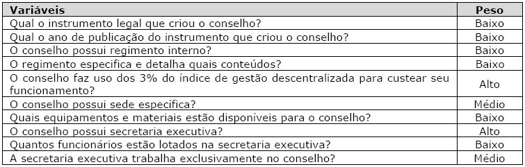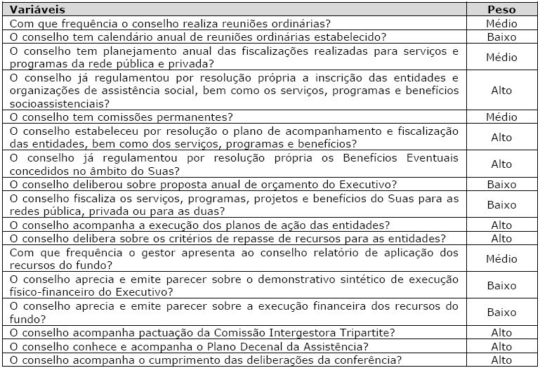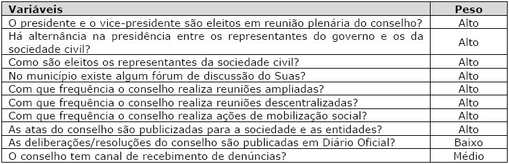 A primeira ressalva a ser feita é no tocante à base de dados utilizada, o Censo Suas 2012. A finalidade desse censo é construir uma base de dados, via preenchimento de formulário eletrônico, com informações dos diversos órgãos e instituições da política de assistência social, de gestão, execução e controle, nos dois níveis federativos menores, estados e municípios. Esse instrumento possibilita a obtenção de um panorama geral sobre o funcionamento dos conselhos, nos aspectos burocráticos, infraestruturais e de pessoal. As perguntas que o estruturam atendem às preocupações dos gestores do MDS, e não às estritamente acadêmicas, de quem estuda os mecanismos de controle social. Logo, levantamos os principais argumentos da literatura naquilo que tange o bom funcionamento dos espaços participativos de controle social, como os conselhos gestores, e, em seguida, buscamos nos questionários do censo quais desses aspectos estavam presentes ou serviriam como proxies.