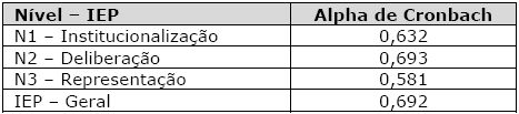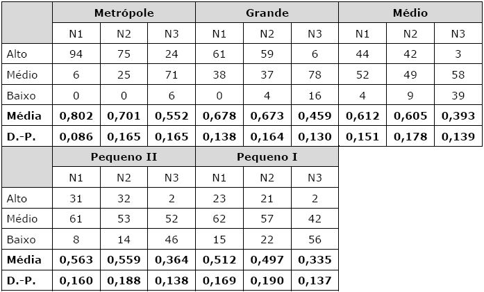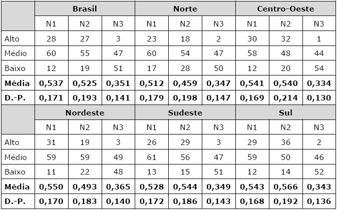 A análise do desempenho do IEP desagregada pelos seus subníveis, institucionalização (N1), deliberação (N2) e representação (N3), aponta expressiva variação. Destes, a representação é o subíndice mais frágil, pois a maioria dos municípios brasileiros (51%) obteve baixos valores nessa dimensão. A deliberação aparece como a segunda mais frágil, porém bem distante da situação anterior: 19% dos municípios apresentaram valores baixos, 55%, médios e 27%, altos. Em uma situação melhor está a dimensão da institucionalização, com 12% de valores baixos, 60%, médios e 28%, altos (Tabela 3). Considerando o desempenho médio nacional em cada nível, a representação aparece com a menor média e menor heterogeneidade, segundo o desvio-padrão. A melhor média é apresentada pela institucionalização, seguida da deliberação, esta apresentando maior heterogeneidade.