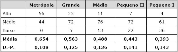 As médias aumentam à medida que o porte do município também aumenta. Inversamente, considerando a heterogeneidade entre os municípios segundo o desvio- padrão, constatamos uma diminuição conforme o porte aumenta. Ou seja, municípios de menor porte possuem menor média e maior heterogeneidade, enquanto os municípios maiores apresentam maior média e menor heterogeneidade. A relação positiva entre o desempenho no IEP e o porte do município pode ser sintetizada na seguinte sentença: quanto maior o porte populacional maior o IEP e, por conseguinte, quanto menor o porte menor o IEP.
