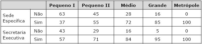 As variações no desempenho do nível institucionalização por porte populacional são ainda explicadas pelos recursos materiais dos conselhos. Nesse aspecto, à medida que aumenta o porte do município, os conselhos têm maior probabilidade de possuir sede e secretaria executiva próprias: