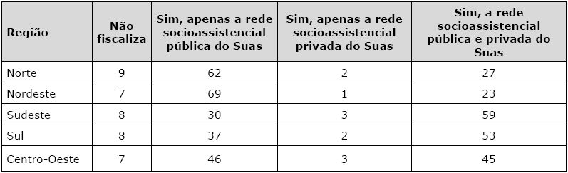 Por outro lado, a maioria dos conselhos (54%) executa uma das atribuições mais importantes que lhes são conferidas, a fiscalização dos serviços oferecidos pela rede socioassistencial, sem um planejamento anual. Os municípios da região Sudeste foram os que mais avançaram nesse quesito: 50% dos conselhos fazem a fiscalização mediante um planejamento. A região Nordeste apresentou a pior performance: 60% dos seus conselhos não executam a fiscalização com o planejamento. As disparidades se acentuam quando considerado o porte populacional do município. A tendência é de que quanto maior o porte, maior a probabilidade de a fiscalização ser informada por um planejamento. Assim, fazem a fiscalização mediante planejamento: 40% dos municípios de porte I; 51% dos municípios de porte II; 62% dos municípios de porte médio; 75% dos municípios grandes e 70% das metrópoles.