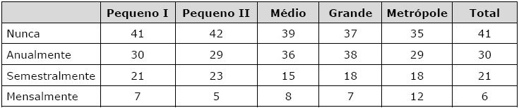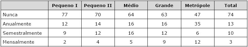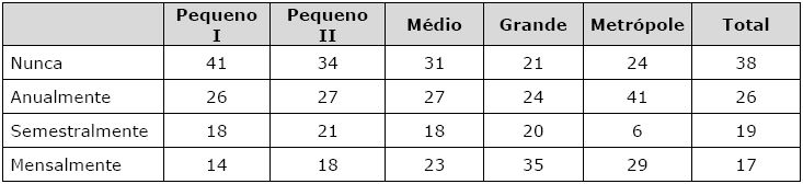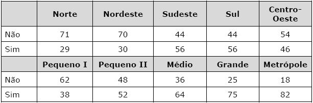 Assim, responderam afirmativamente: 43% dos conselhos de municípios de porte I, 49% dos de porte II, 58% dos municípios médio, 67% dos municípios grandes e 82% das metrópoles. A disposição desses dados por região demonstra que o Nordeste e o Sudeste possuem o maior número de conselhos com esse dispositivo: 49%. As demais regiões acompanharam as médias nacionais.
