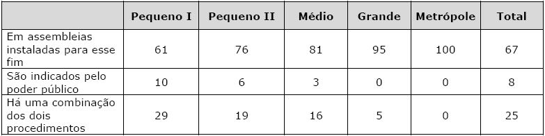 Em 67% dos conselhos, os representantes da sociedade civil são eleitos em assembleias instaladas especificamente para esse fim, em apenas 8% dos casos eles são indicados pelo poder público e, em 25%, há uma combinação dos dois procedimentos: assembleias e indicação do poder público (Tabela 13). Esses indicadores apontam que nesses conselhos está razoavelmente presente uma igualdade na representação governamental e da sociedade civil e um razoável controle por parte desta última na determinação de sua representação. Todavia, distinções segundo o porte populacional indicam que o procedimento de escolha do representante da sociedade civil no espaço público é mais universalizado nos municípios de maior população (Tabela 13). No que se refere ao recorte regional, apenas no Centro-Oeste, 13% dos representantes da sociedade civil são indicados pelo poder público e 55%, em assembleia. Em 32% dos casos, os procedimentos são combinados. As demais regiões seguem as médias nacionais.