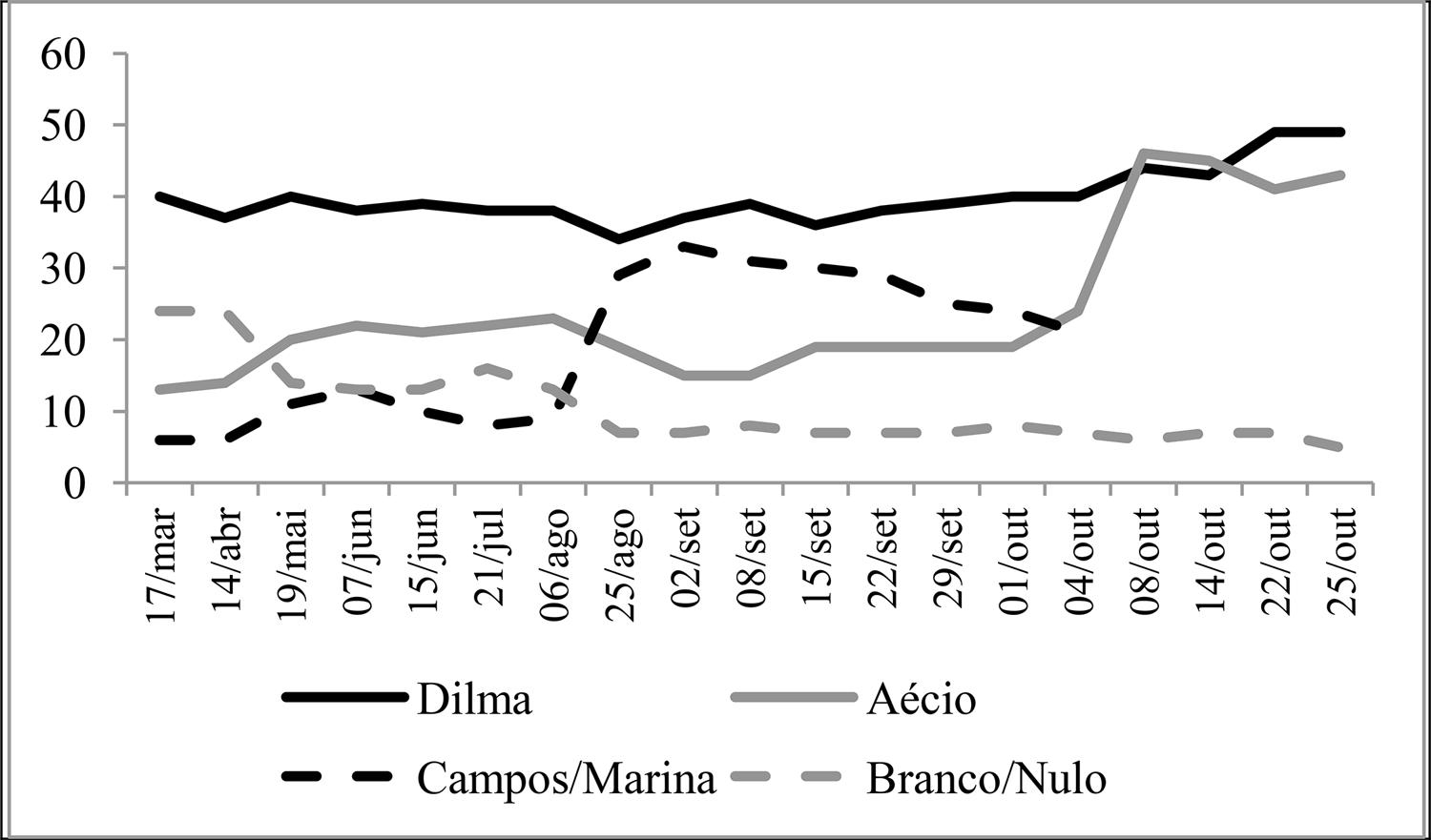 A disputa presidencial de 2014 aconteceu entre a então presidente Dilma Rousseff (PT), o seu principal adversário Aécio Neves (PSDB), Marina Silva – que assumiu a liderança da chapa após a morte de Eduardo Campos em 13 de agosto, Pastor Everaldo, Eduardo Jorge, Levy Fidelix, Luciana Genro, Eymael, Zé Maria, Mauro Iasi e Rui Costa Pimenta. Na pesquisa Ibope de 21 de julho, Dilma somava 38% das intenções de voto, contra 22% de Aécio e apenas 8% de Eduardo Campos, cenário que se manteve estável até a morte do candidato do PSB.