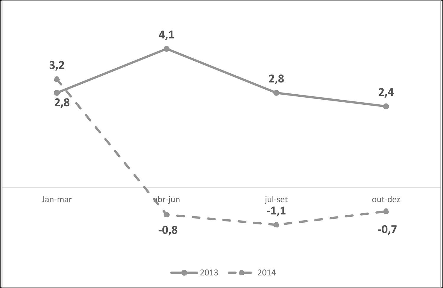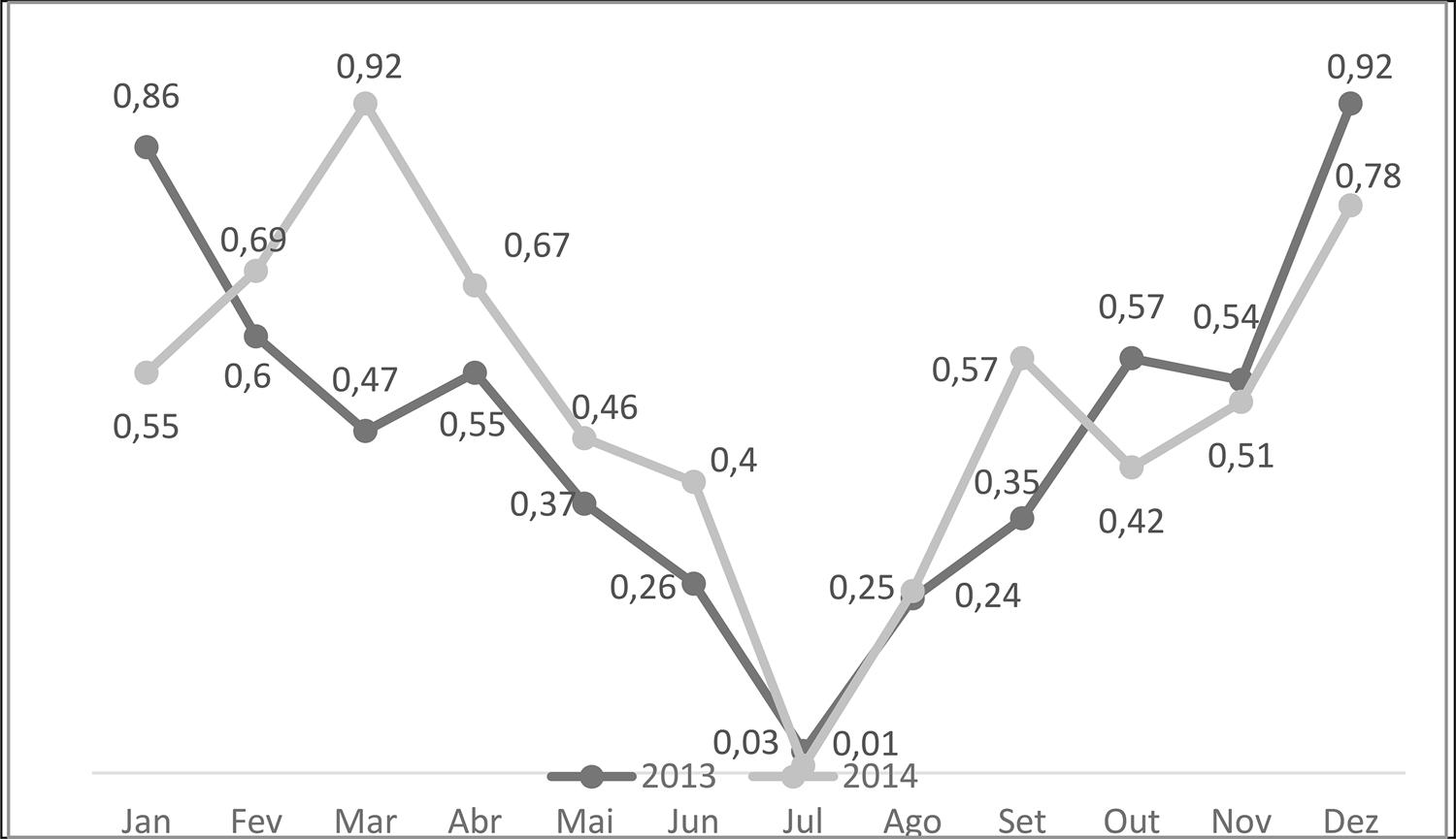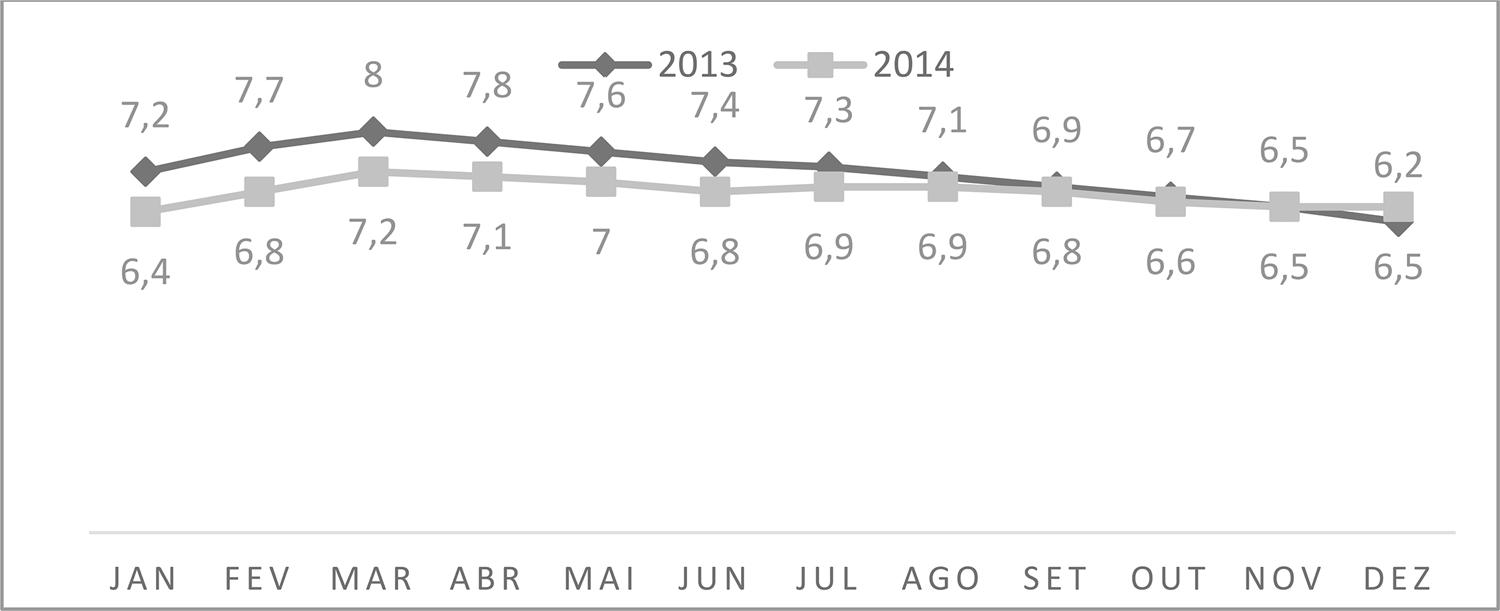 A realidade da economia que antecede à disputa presidencial de 2014, tomando as taxas de desemprego e de inflação (IPCA – Índice Nacional de Preços ao Consumidor Amplo) oficiais do governo federal levantadas pelos IBGE, aparece relativamente estável, com variações mensais muito semelhantes entre 2013 e 2014 (ver Gráficos 2 e 3). A taxa de desemprego variou de 6,20 a 7,20 nos 12 meses que antecederam a disputa. A taxa de inflação teve uma variação acentuada se pegarmos o mês de julho de 2014 – com taxa de 0,01 – e o mês de dezembro de 2013 – com taxa de 0,95, contudo predominou o índice próximo de 0,50.