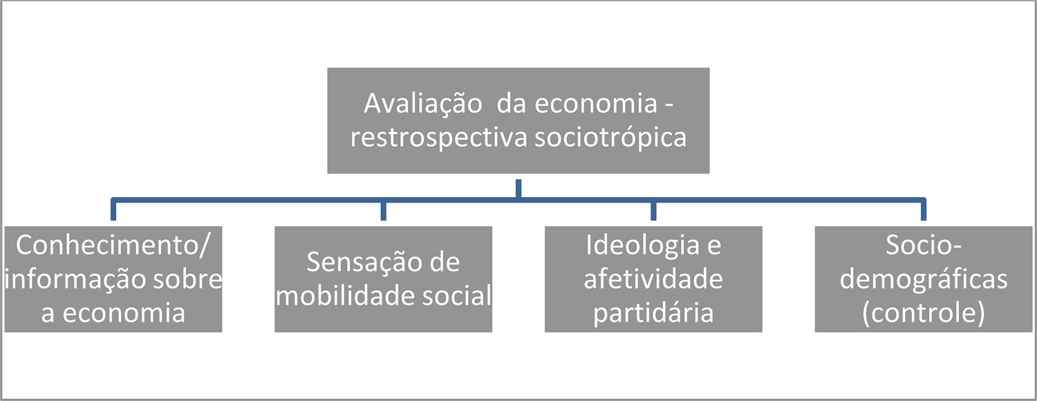 A teoria do voto econômico – em sua versão retrospectiva sociotrópica – parte do princípio de que eleitores fazem um julgamento da situação econômica do país e a partir daí tendem a votar pela reeleição do mandatário e/ou de seu partido em situação de satisfação com o desempenho do governo e em votar na oposição em situação de insatisfação. Assim, haveria um vínculo entre avaliação positiva da economia e adesão ao partido do governo, precisamente nesse sentido de causalidade. Alguns estudos – que tendem a ter a importância de seus achados reduzidos nessa literatura – apontam para o sentido contrário da causalidade. A avaliação da economia que seria, outrossim, uma consequência da predisposição política dos eleitores (Erikson, 2004; Wlezien, Franklin e Twiggs, 1997).