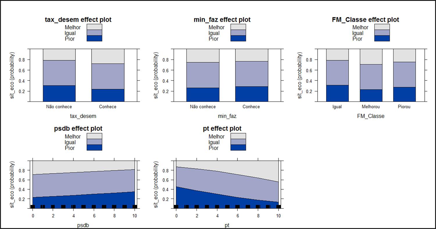 Em um modelo de regressão logístico ordinal é possível construir um gráfico de efeitos conforme sugerido por Fox (1987, 2003). Esse tipo de gráfico permite a interpretação dos resultados dos modelos estatísticos por meio da visualização da contribuição marginal da variável na probabilidade. Nesse gráfico, podemos ver o impacto das variáveis afetividade partidária com PT e PSDB e da variável sensação de mobilidade social na percepção da avaliação econômica. Os gráficos de efeitos do modelo logit ordinal são mostrados abaixo.