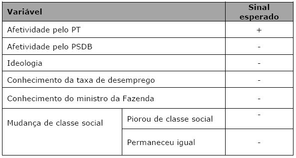 Esperamos que a afetividade partidária se faça refletir na avaliação retrospectiva do eleitor sobre a economia. Nesse caso, acreditamos que o aumento da nota (de 0 a 10) para quanto gosta do PT – legenda governista – vá incorrer em aumento da probabilidade de avaliação mais positiva da economia. Já o aumento da nota (de 0 a 10) para quanto gosta do PSDB – principal partido oposicionista – irá levar à redução da probabilidade de avaliação mais positiva da economia.