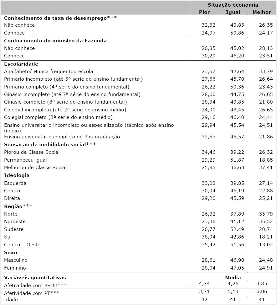 As variáveis “conhecimento da taxa de desemprego”, “sensação de mobilidade social”, “região geográfica” e “afetividade partidária” foram significativas, isto é, estão relacionadas com a percepção da situação econômica. Desse modo, podemos considerar que, individualmente, elas podem ser utilizadas para discriminar a percepção da situação econômica em pior, igual ou melhor. Na sequência, avaliaremos simultaneamente todas as variáveis independentes em uma perspectiva de modelagem.