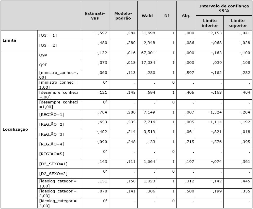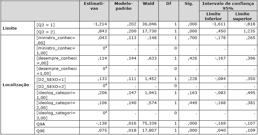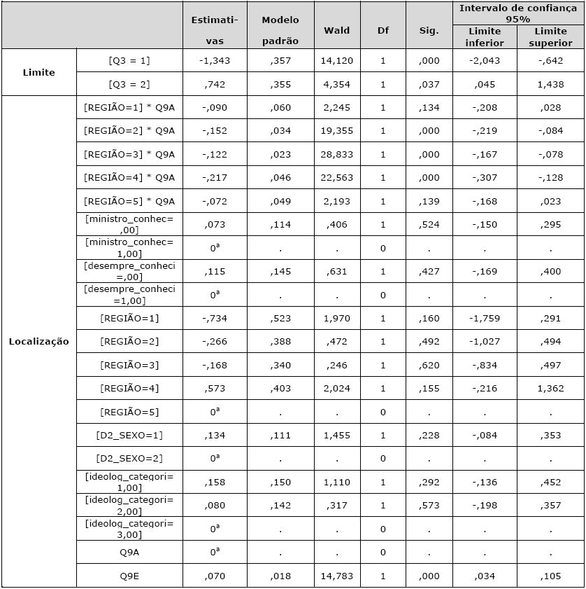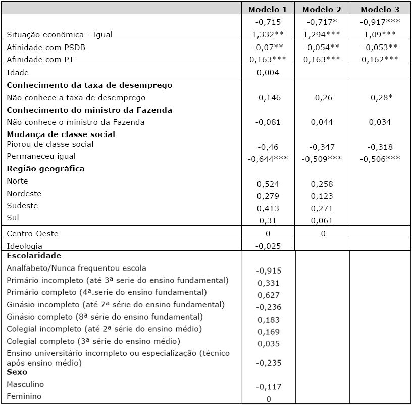 Em uma primeira análise, foi desenvolvido o modelo com todas as variáveis explicativas (ver Anexo 2). Todavia, tendemos a retirar as variáveis explicativas que não foram significativas no nível de 0,05. Exceção para as variáveis “conhece o ministro da Fazenda” e “conhece a taxa de desemprego”, que foram mantidas no modelo final, apesar de não terem sido significativas desde logo, por sua importância neste artigo. O modelo linear generalizado logit ordenado foi testado e os resultados das variáveis independentes em relação à avaliação da economia são apresentados na Tabela 3. Nessa tabela, podemos ver o impacto de cada variável explicativa na variável dependente. Conforme é verificado nessa tabela, o modelo final foi significativo (p-value = 0,000).