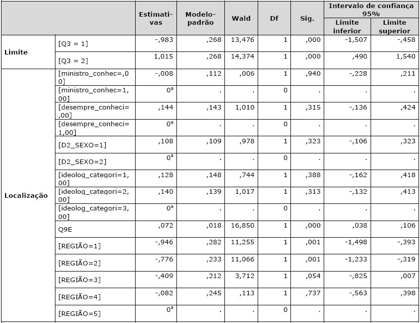 Em relação às categorias da variável dependente (ancillary parameters), considerando como base a categoria pior a atual situação econômica do Brasil, podemos observar o efeito das outras categorias sobre a base e testar a significância. Nesse sentido, podemos dizer que existe diferença entre a situação pior para e a base (p-value = 0,000) e a categoria igual e a base (p-value = 0,000).