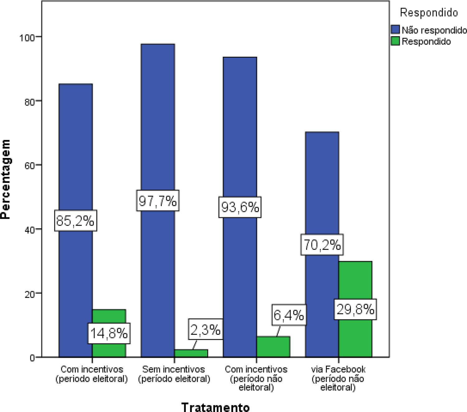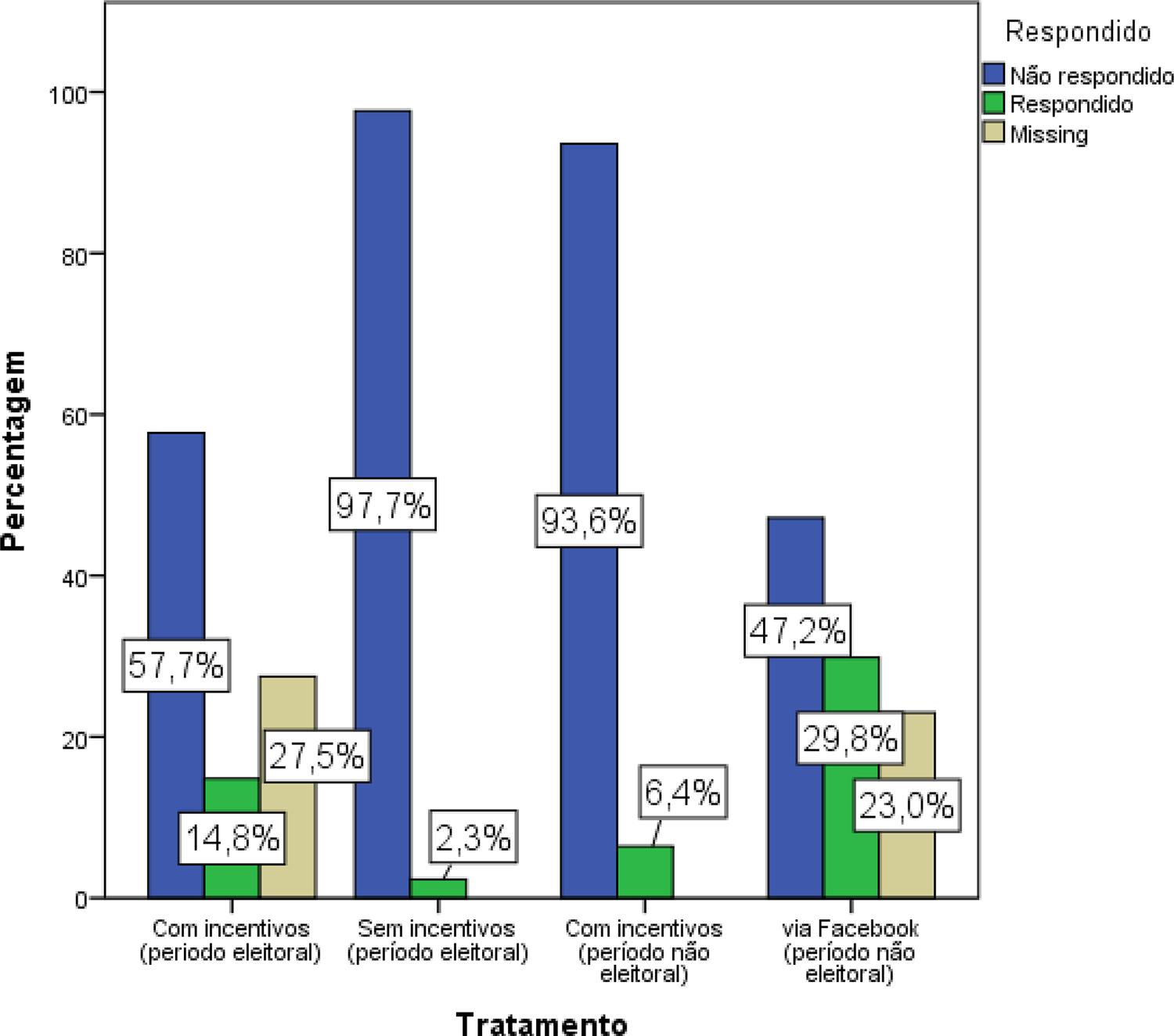 Podemos, desde já, verificar as distinções claras entre cada tipo de incentivo. As mensagens sem incentivos eleitorais geraram apenas 12 respostas, enquanto aquelas com incentivos eleitorais (mesmo que nessa categoria existam 141 missings) obtiveram 76 respostas. Ambos os tipos de mensagem em período eleitoral. Já no período não eleitoral, mesmo com incentivos, foram obtidas apenas 33 respostas. Já no Facebook, mesmo que apenas 395 representantes estivessem presentes na rede ou permitissem envio de mensagens privadas, foram obtidas 118 respostas.
