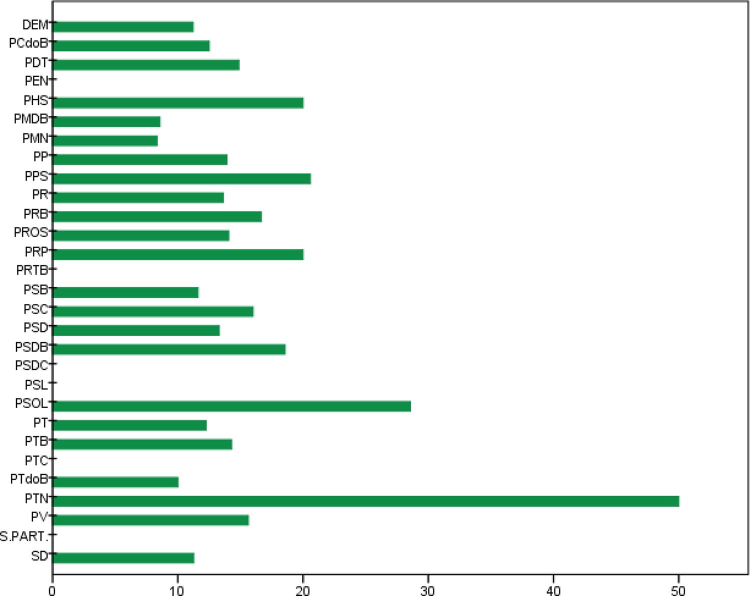 Escala de ideologia política, com cinco níveis, que vai da esquerda à direita. A classificação realizada foi a seguinte: esquerda: PSOL; centro-esquerda: PT, PSB, PCdoB; centro: PV, PSDB, PPS, PMDB, PDT; centro-direita: PP, PR, PRB, PROS, PSD, PTB, PTC, SD; direita: DEM, PEN, PHS, PMN, PRP, PRTB, PSDC, PTdoB, PTN. Não classificado: Sem partido.