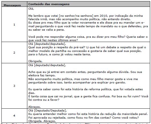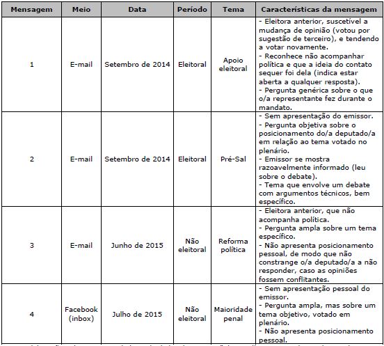 O Quadro 1 sintetiza as características das mensagens enviadas. O conteúdo completo das mensagens está no Anexo: