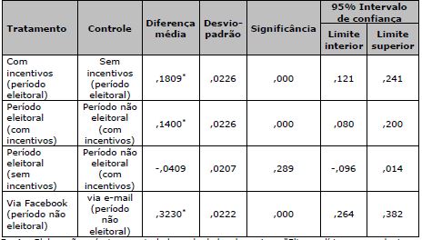 A seguir, o teste de Bonferroni para diferenças de médias averigua as diferenças estatísticas em quatro comparações. Como já explicado, o primeiro modelo calcula o e-mail com incentivos em relação ao e-mail intrusivo (e-mails sem incentivos ou de conteúdo técnico), ambos no período eleitoral. A segunda e a terceira comparações testam os e-mails enviados no período eleitoral, com base nos e-mails enviados no período não eleitoral. A distinção é que a segunda comparação utiliza os e-mails com incentivos e a terceira os e-mails intrusivos. Enfim, por último, comparam-se as mensagens enviadas via Facebook em relação aos e-mails, ambos no mesmo período (não eleitoral).