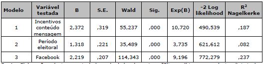 Temos, portanto, três modelos distintos, que comparam os parâmetros propostos, a fim de isolar os possíveis efeitos. O primeiro modelo compara somente o conteúdo das mensagens 1 e 2. O segundo modelo se propõe a comparar os períodos das mensagens e apresenta duas variações: a primeira compara a mensagem 3 (não eleitoral) com a 1 (eleitoral, com incentivos para resposta); a segunda compara a mensagem 3 com a 2 (eleitoral, mas sem incentivos). O terceiro modelo compara as mensagens 3 e 4, enviadas no mesmo período (não eleitoral), por plataformas distintas (e-mail e Facebook).