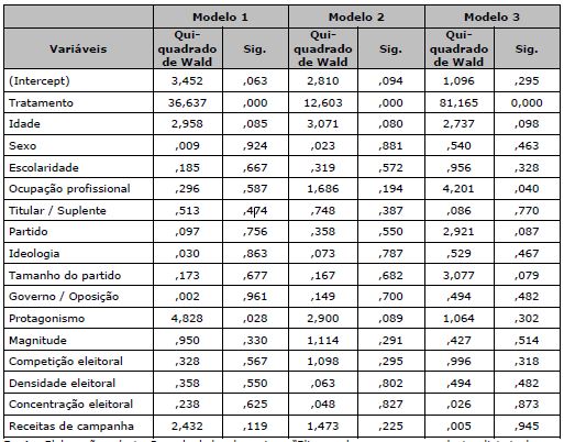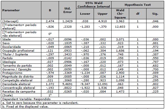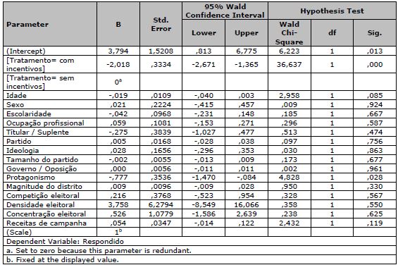 A seguir, realizamos uma regressão logística, apropriada para variáveis dependentes binárias, a fim de identificar as probabilidades de que um evento ocorra em relação a outro. Ou seja, qual porcentagem a mais de chances de obter uma resposta dos representantes cada tratamento implica? As bases de comparação utilizadas no teste são as mesmas já descritas anteriormente para as diferenças de médias. Como já ficou mostrado no teste de diferenças de médias que o período eleitoral sem incentivos confrontado com o período não eleitoral com incentivos não produz diferenças relevantes, não utilizamos esse modelo na regressão, remanescendo os três demais.