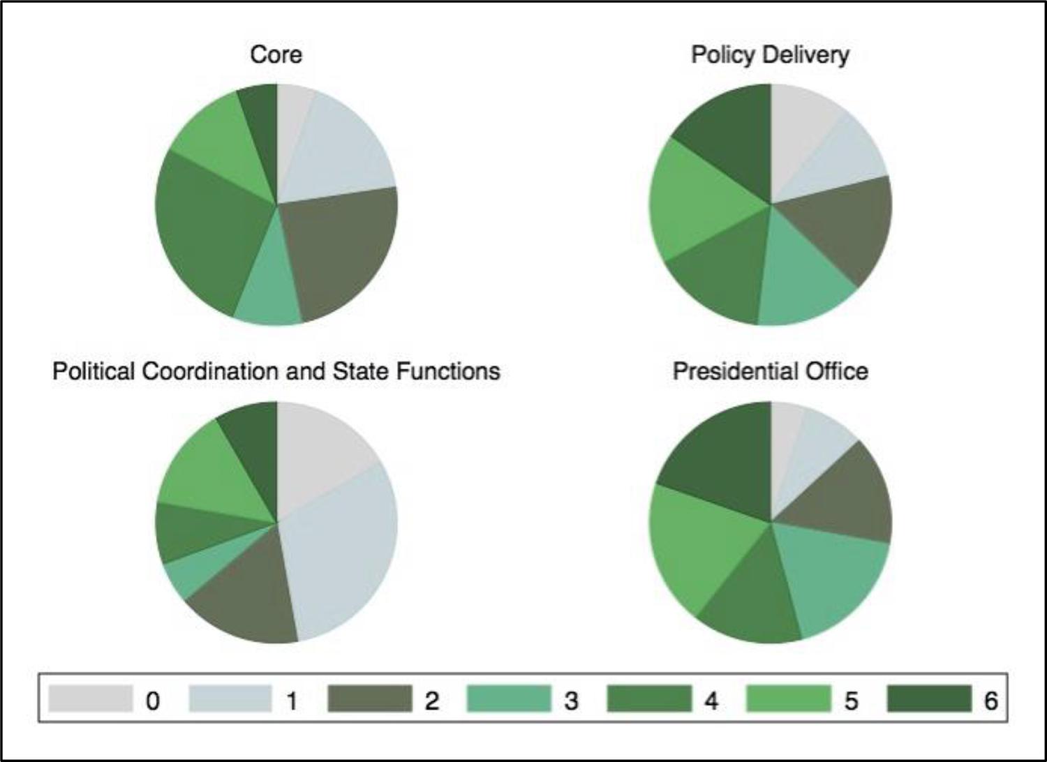 Based on the IMP, in Figure 2, the darker the slice of the pie chart, the more politicized the appointments. It is noted that the nominations to the core were, on average, less politicized than those made to policy delivery units and to the presidential office. In relation to the political coordination and State functions, this difference is less highlighted, since the latter has a higher concentration of technical profile appointments, the initial stages of the Index of Ministerial Politicization. The core has a greater number of ministers with hybrid or technical-political profiles in comparison to the units of political coordination and State functions, although it has similar values for more politicized appointments at the end of the scale.