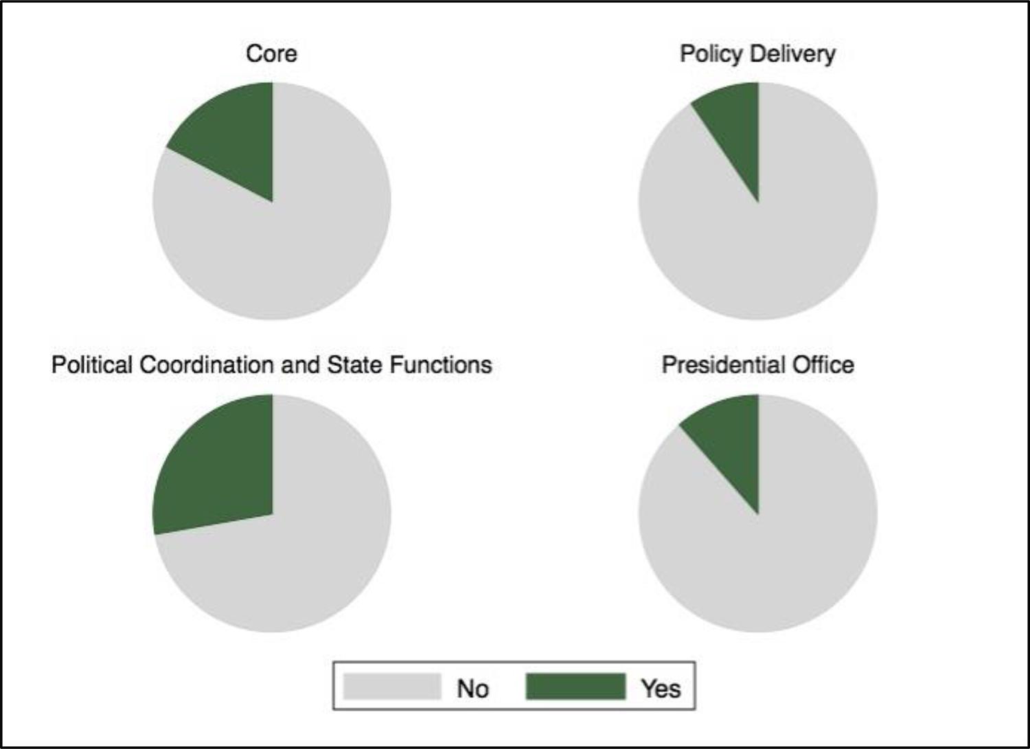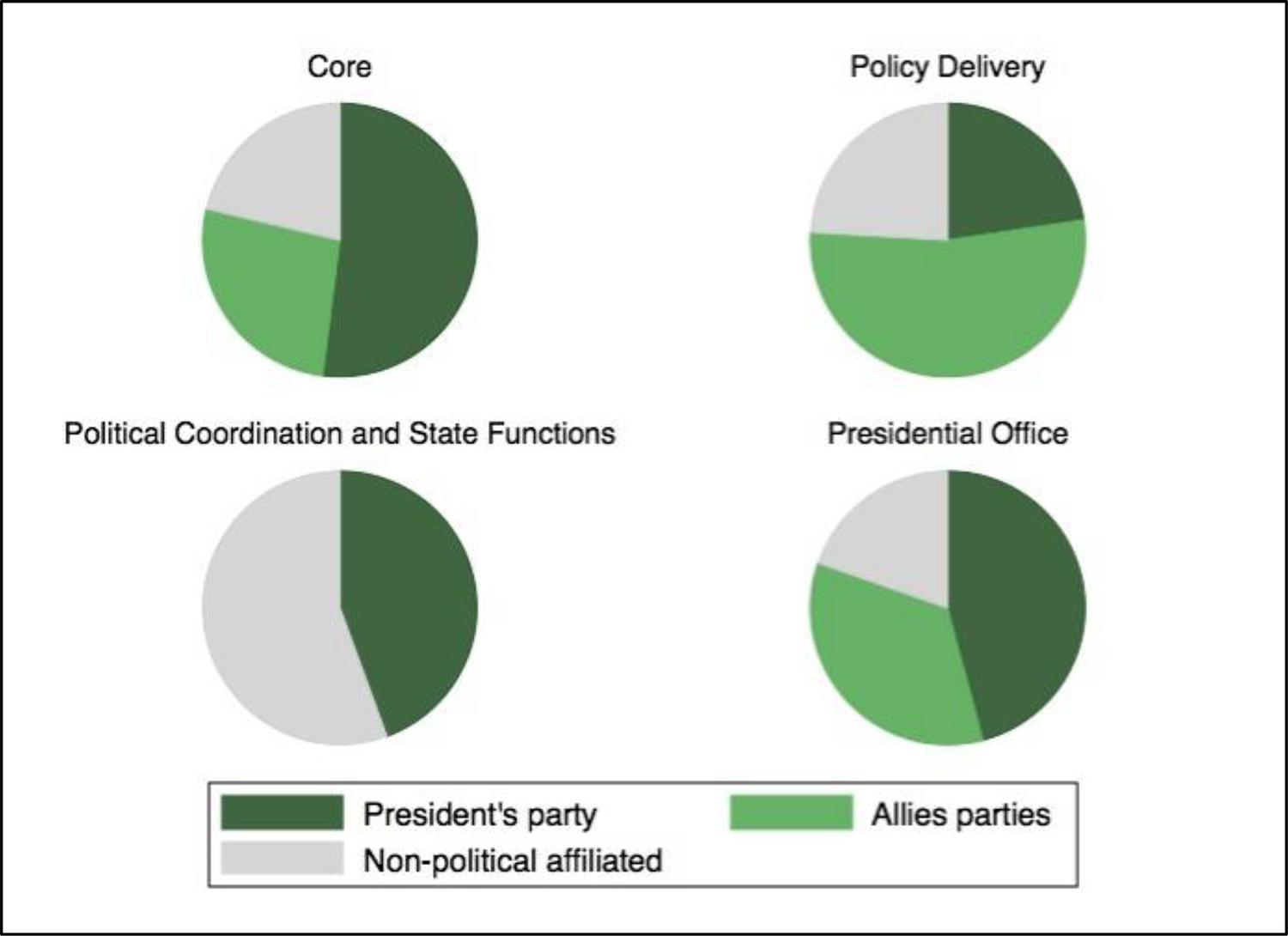 Figure 3 shows differences between government areas, focusing on party affiliation. The core area has a majority of appointments of candidates from the president's party, although there is also a significant presence of non-affiliated candidates and allies, the latter in a smaller proportion than in policy delivery and Presidential office units. Policy delivery is predominantly occupied by ministers from the coalition’s parties, while this pattern did not occur in ministries of political coordination and State functions. Finally, the presidency and the smaller departments are equally divided among members of the president’s party and allies, leaving just a minor part to ministers with no political affiliations.