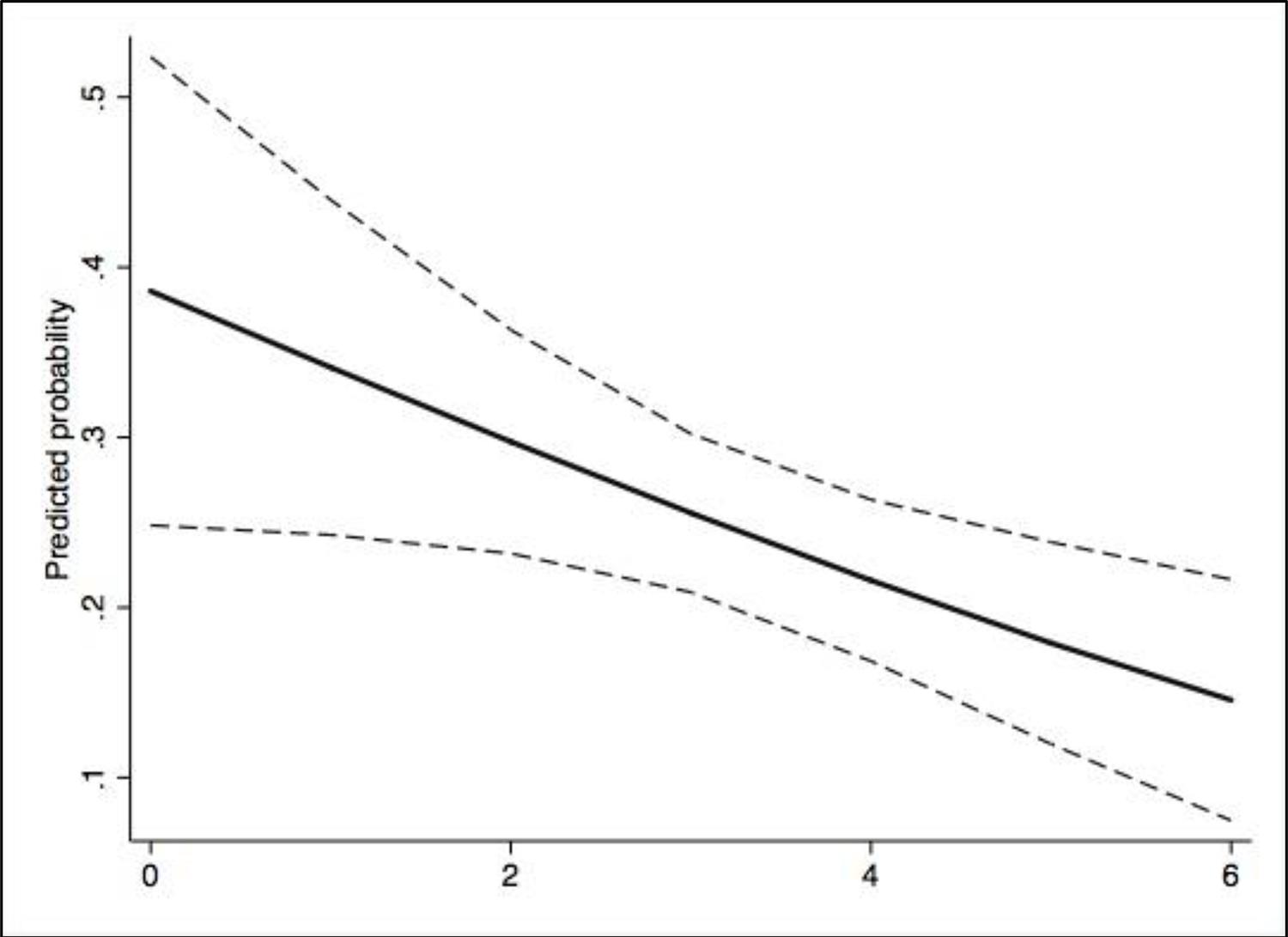 The Figure 5 addresses the predicted probability of ministerial appointments according to the index of ministerial politicization. It is noticeable a declining line in which the greater the politicization of ministers, the less likely they are to be appointed in the core cluster.