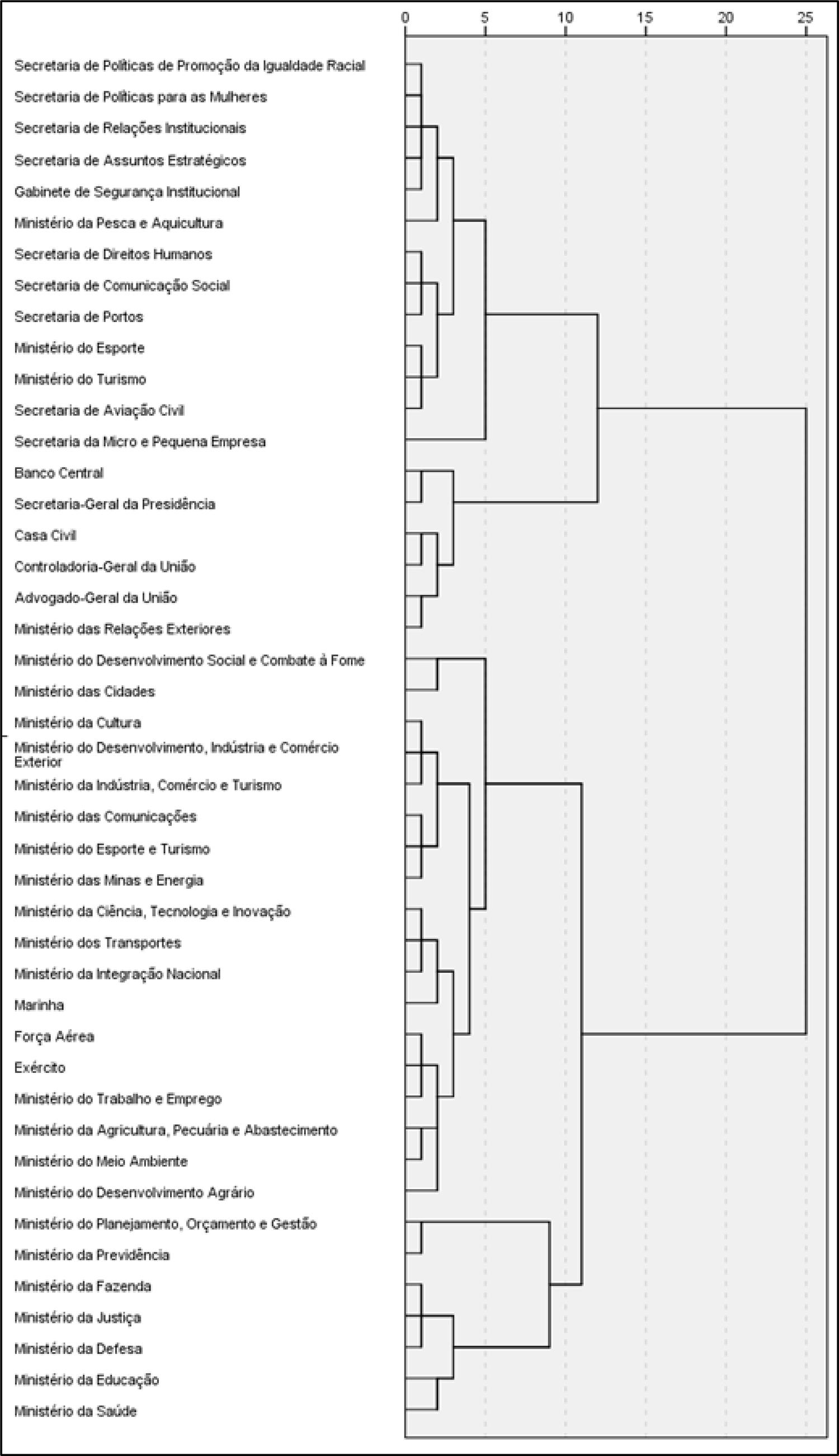 Determining the number of clusters is not a simple task and, as for other definitions in statistics, must take into account the research objectives and the adopted theory (Fávero and Belfiore, 2015). Based on this, the solution with four clusters was chosen, which is the second major jump, similar to the solution with five clusters, with the advantage of not differentiating in an isolated cluster the Ministries of Planning and Social Security. There are theoretical reasons to insert them into a core cluster (Rennó and Wojcik, 2015; Pereira et al., 2013). The solution with three clusters, besides not being visible in the dendogram, results in a smaller jump than the previous options.