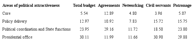 It is worth noting that, despite the prominence of the core area as the most politically attractive, a hierarchy cannot be observed among them. Although the policy delivery units can be classified in the second place, this category does not differ in terms of agreements and civil servants. The last two groups, although clearly less attractive than the first two, are even less distinguishable from each other, as can be seen in the networking and patronage dimension.