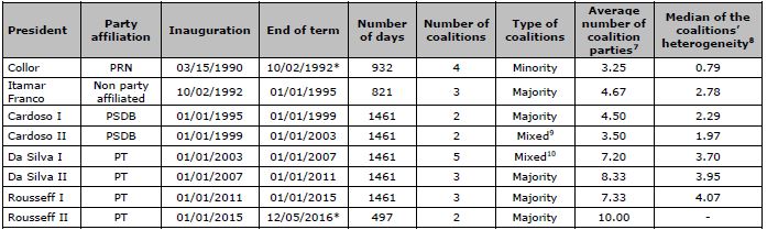 Collor’s administration initiates Brazil’s historical experience with 3.25 parties, on average, in his coalition and a median of the parties’ heterogeneity of 0.79, on a scale ranging from 1 (left) to 10 (right). That is, few relatively homogeneous parties were selected according to their ideological point of view. Franco and Cardoso’s administrations aggregate a higher average of parties—about four—and extend the ideological heterogeneity beyond two. On the other hand, Da Silva and Rousseff’s terms raised the maximum number of parties in the coalitions, more than seven, with ideological heterogeneity, reaching 4 points, including parties from across the (leftist and rightist) spectrum.