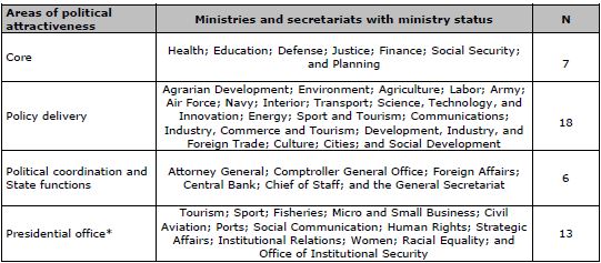 Policy delivery virtually encompasses all ministries responsible for policymaking, with the exception of smaller ministries that are more similar to Presidency secretariats, in line with the findings of Inácio and Llanos (2015) and by Lameirão (2015). The grouping of ministries by criteria of political attractiveness divides the so-called institutional Presidency into two distinct groups. On one side, units responsible for State functions, such as the Attorney General, Comptroller General’s Office, Foreign Affairs, and Central Bank, and those charged with political coordination, the case of the Chief of Staff (Casa Civil) and the General Secretariat. On the other, the second group includes the departments mainly responsible for policies, including the less attractive ministries, and those in charge of presidential security and the daily political articulation.