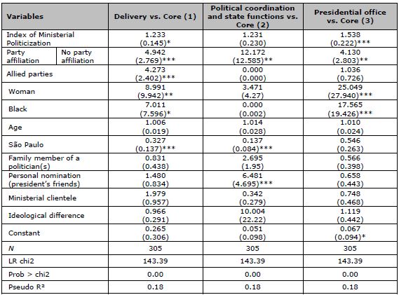 Based on that, a multinomial logistic regression was used in order to identify appointment strategies adopted by presidents. The models’ results show that ministers’ features affect their appointments in different ways. Primarily, the president’s party peers, those supporting the coalition, or ministers without partisan affiliation, as well as their level of politicization, are important dimensions of portfolio allocation in Brazil. In this sense, the minister profile changes according to the policy area. In fact, these variables depict delegation’s inherited costs between the Principal (the president and, in most cases, party leaders) and its Agents (State ministers).
