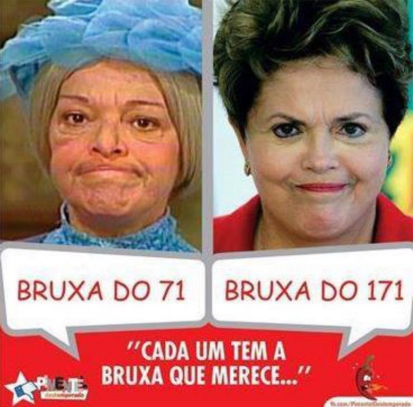A difusão de conteúdos contrários e depreciativos sobre Dilma não foi, evidentemente, propagada exclusivamente por memes digitais; pelo contrário, eles se articularam à própria campanha construída contra a ex-presidenta e contra o Partido dos Trabalhadores pelos meios de comunicação de massa hegemônicos ao longo das últimas décadas no país (Araújo, Costa e Fittipaldi, 2016; Rennó e Ames, 2014; Bezerra e Mundim, 2011; Miguel, 2010). No entanto, a maneira pela qual essas produções digitais circularam e seguem circulando na web brasileira, disseminando humor político e estereótipos de gênero, nos parece motivo de análises particulares, pois sua repercussão sinaliza a emergência de artefatos culturais que configuram práticas sociais articuladas em rede com ampla capacidade expressiva para afetar as percepções e as sensibilidades das pessoas em relação ao comportamento político.