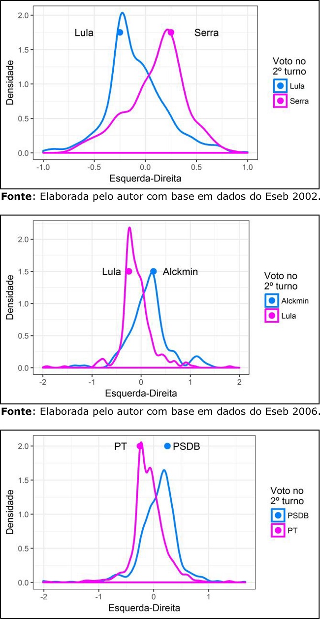Analisando as eleições de 2010, Nicolau (2014) explorou o impacto de diversas variáveis sobre o voto dos principais candidatos a presidente (Dilma, Serra e Marina), dentre elas o autoposicionamento na escala esquerda-direita. O autor transformou a escala ideológica de 11 pontos em três categorias: esquerda (de 0 a 3), centro (de 4 a 6) e direita (de 7 a 10). Os resultados apontam que a probabilidade do voto na candidata do PT é alta em todo o espectro ideológico. Isto é, mesmo eleitores que se posicionaram como de centro, de direita ou não se posicionaram tinham uma alta probabilidade de votar em Dilma. Já a probabilidade de se votar no candidato do PSDB aumentava da esquerda para a direita.